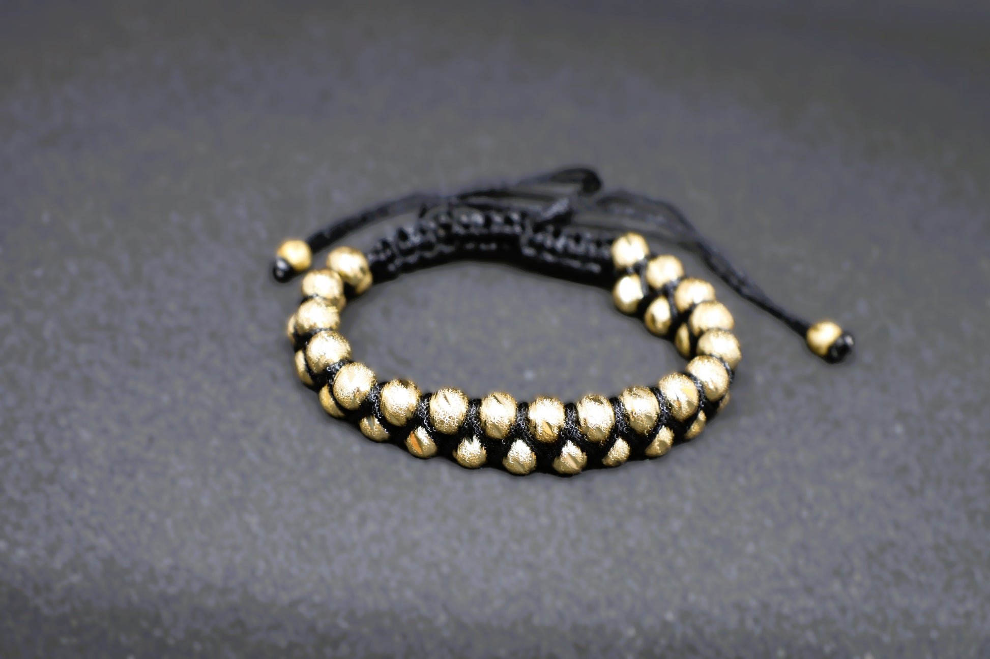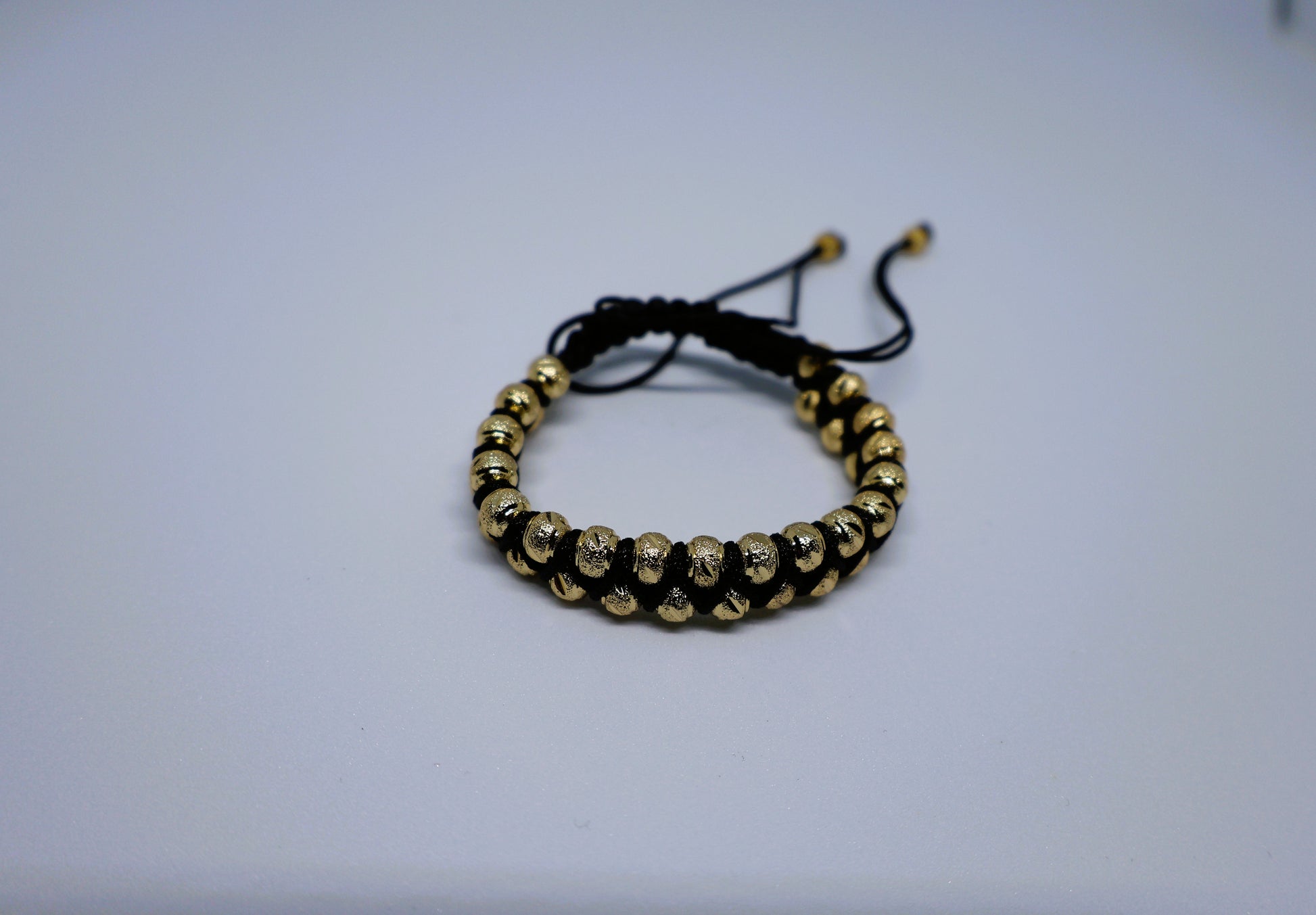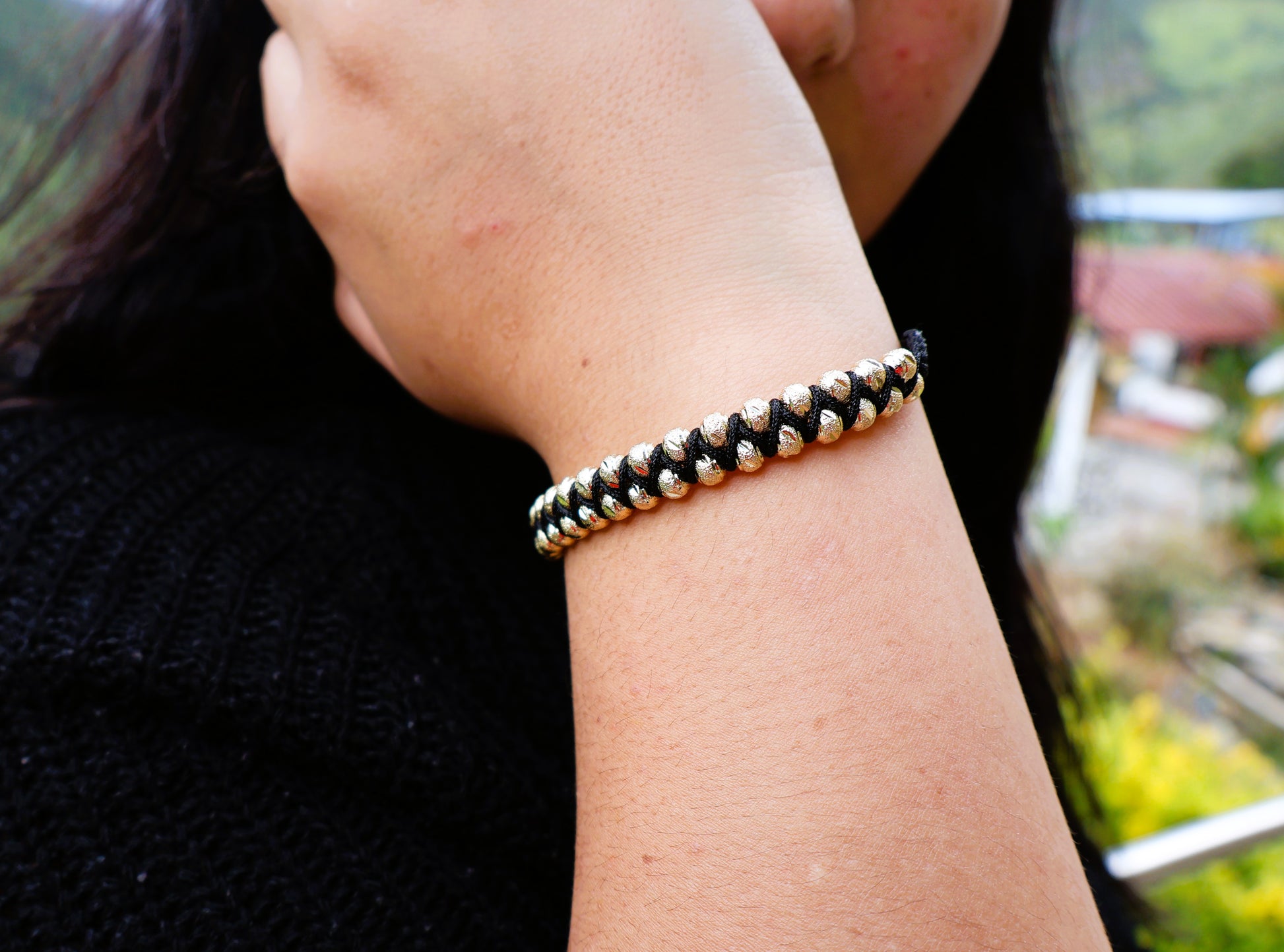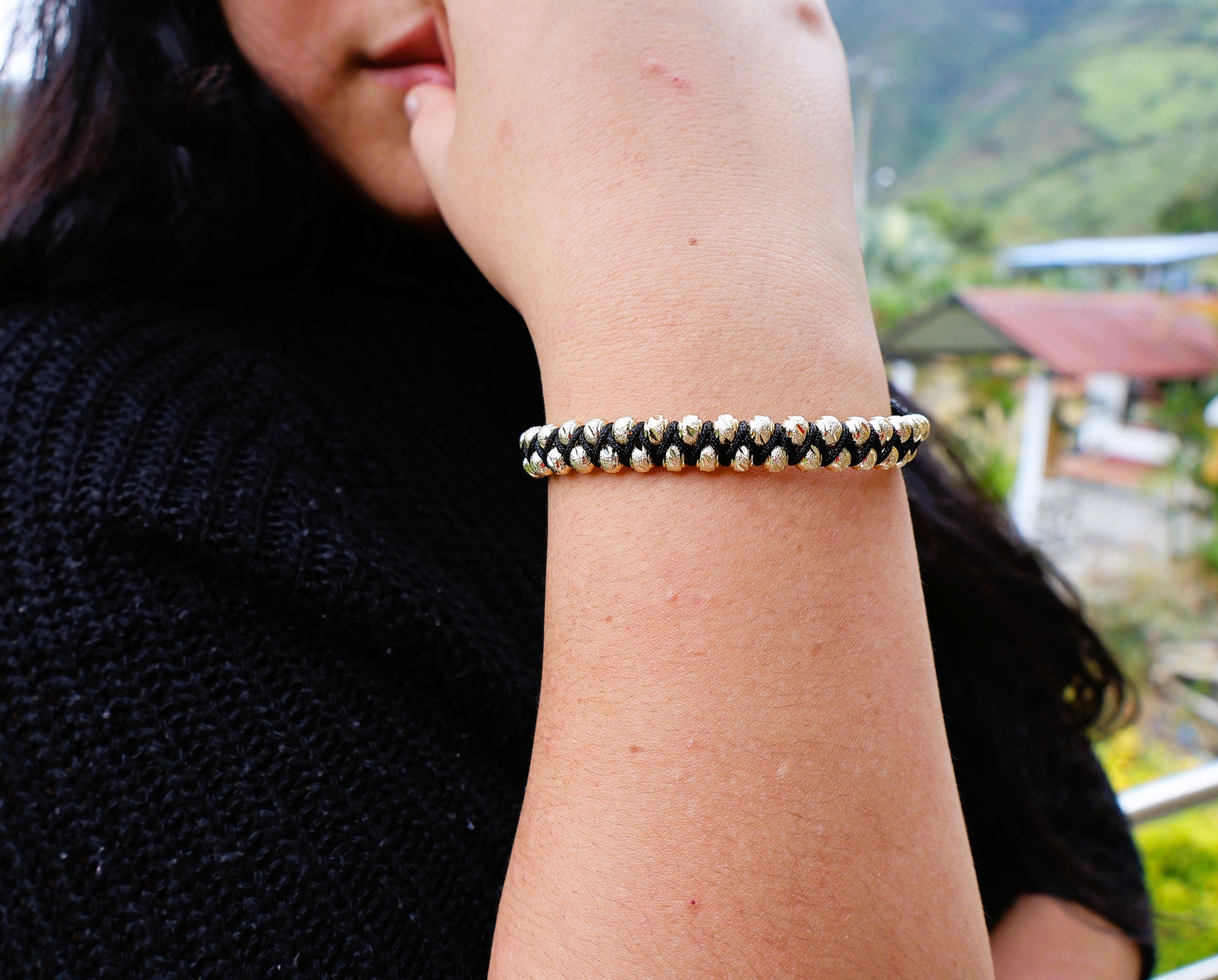 Su diseño con 36 balines de oro laminado de 5 mm, finamente tejidos, la convierte en una pieza única y versátil.