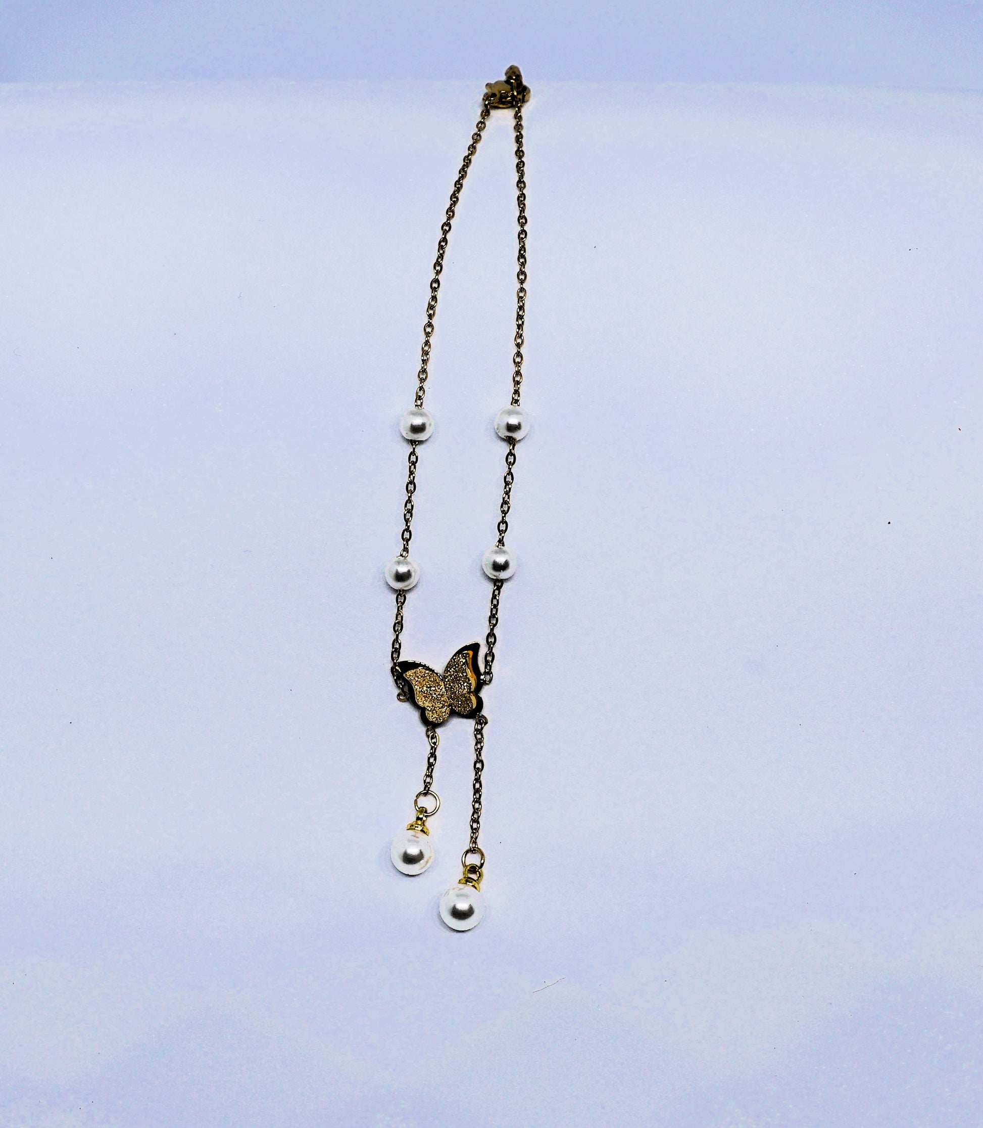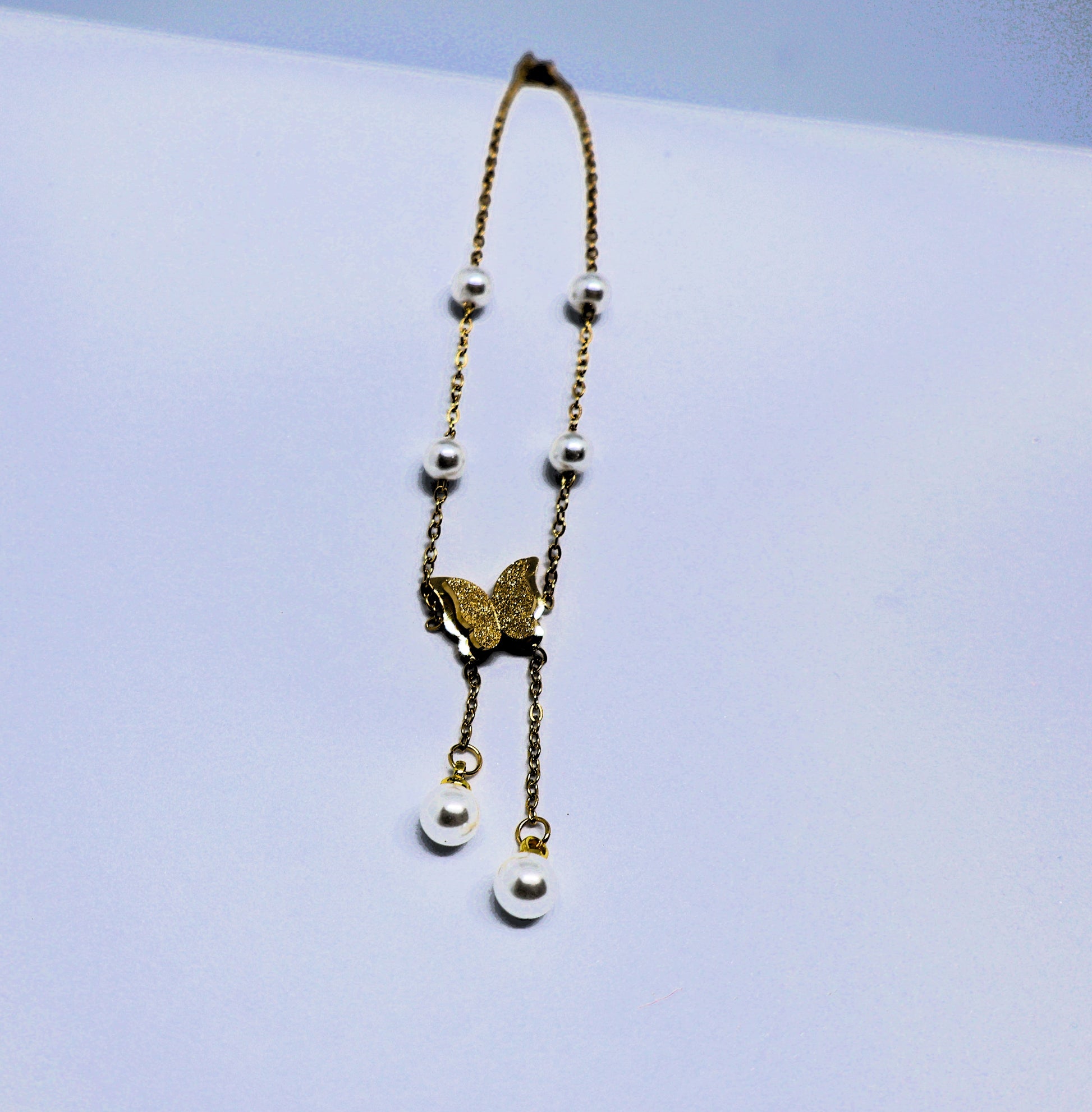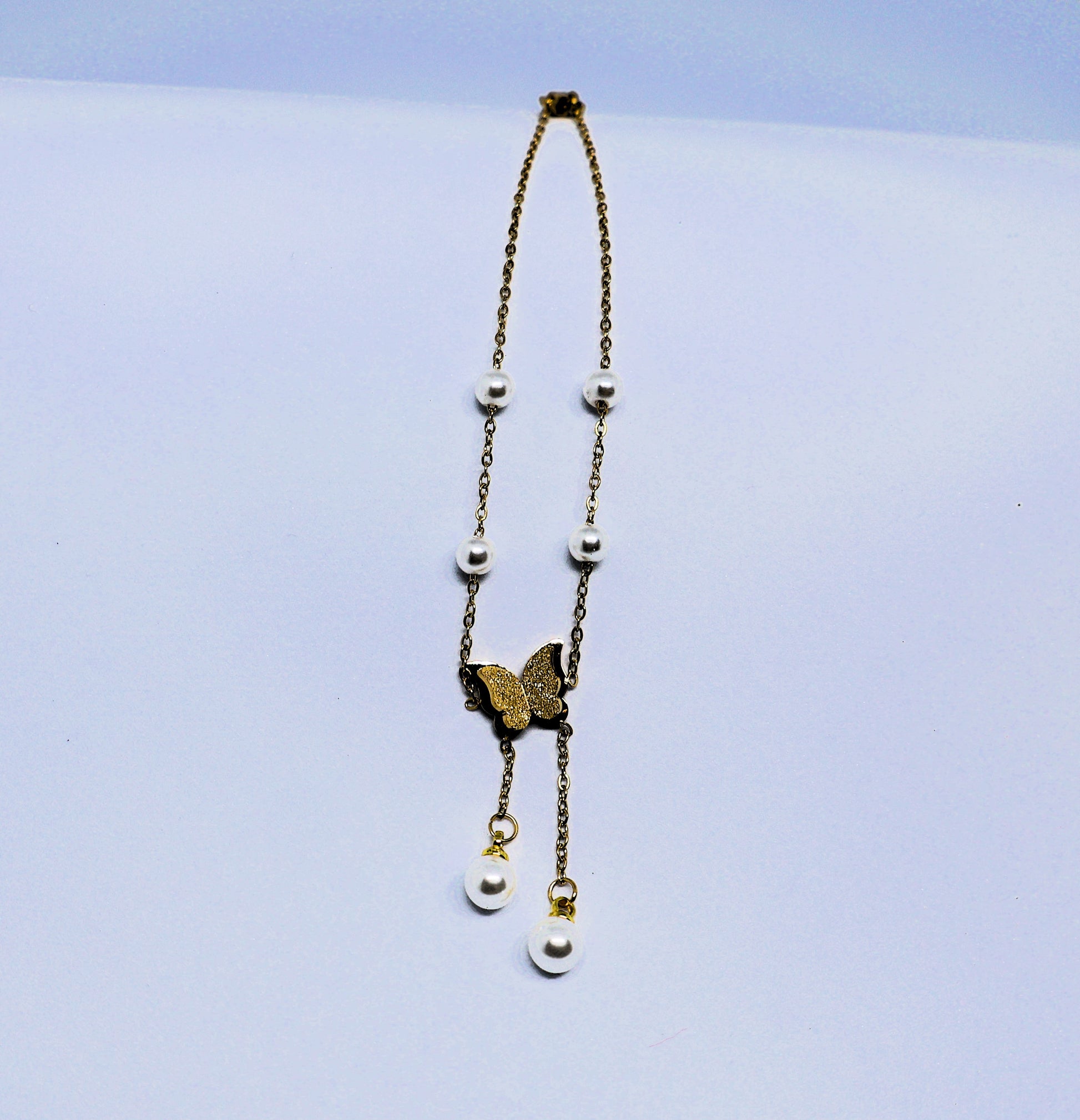 Eleva tu estilo con esta delicada tobillera ajustable de diseño exclusivo que combina mariposas y perlas . Su acabado brillante refleja elegancia y sofisticación, perfecta para lucir sola o combinar con otros accesorios.